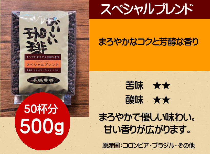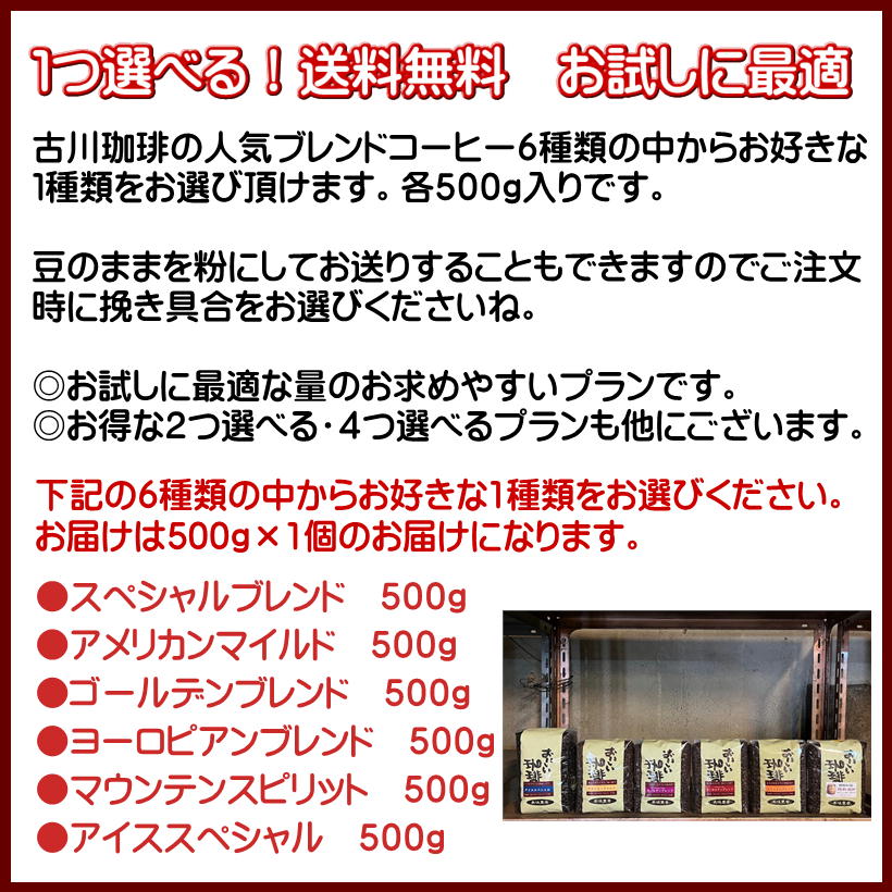 1つ選べる!古川珈琲のおいしい焼きたてブレンド 500g×1個 500g 送料無料 ツイートする シェアする 販売価格: 3,150円(税込み) 会員価格 (税込み) 通常価格 (税込み) 在庫 22 商品コード 500furukawacoffees JANコード 【1】 お選びください スペシャルブレンド アメリカンマイルド ゴールデンブレンド ヨーロピアンブレンド マウンテンスピリット アイススペシャル 挽きぐあい お選びください 豆のまま 中挽き(ペーパー・メーカー) 細挽き(サイホン) あら挽き(ネルドリップ) 数量 - + カートに入れる 入荷通知メールを希望する 個別送料 0円